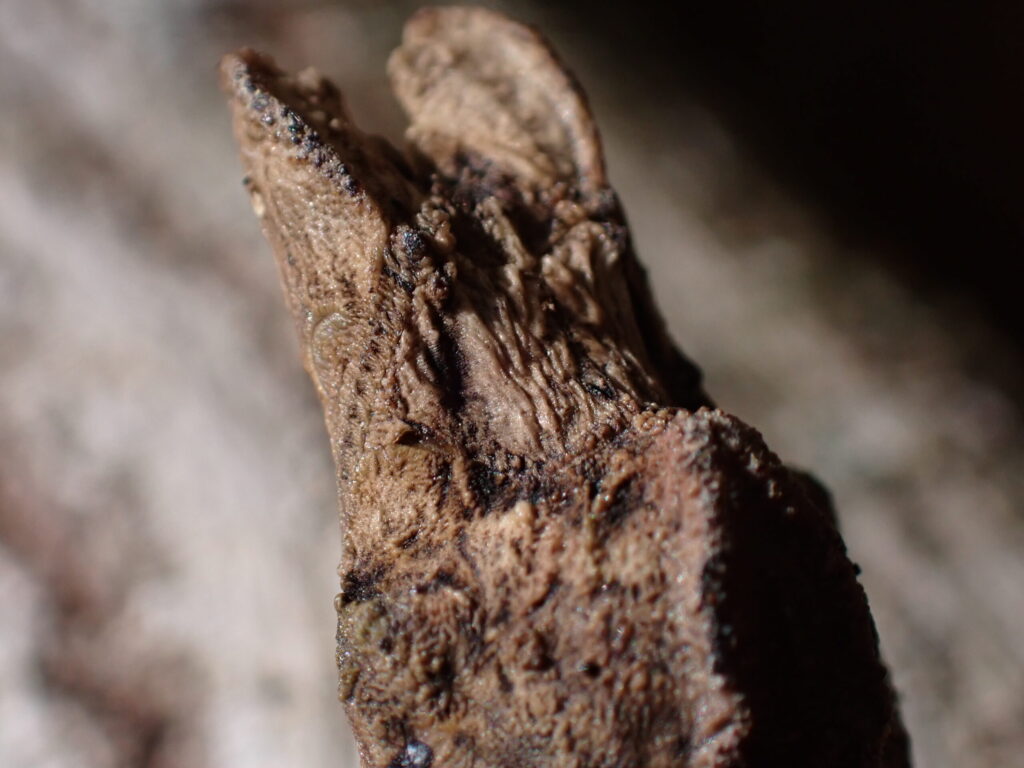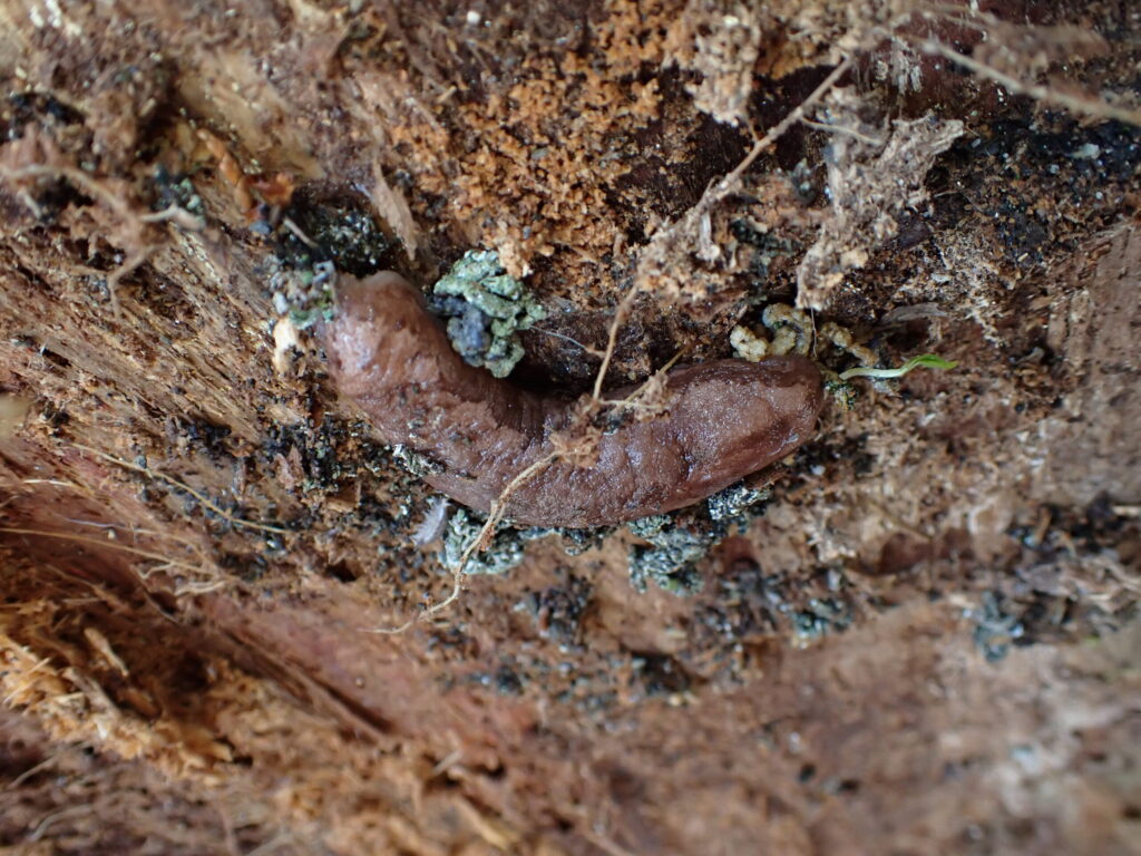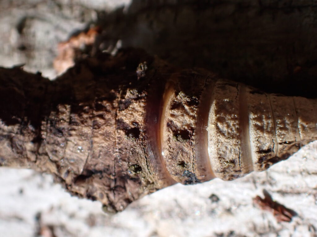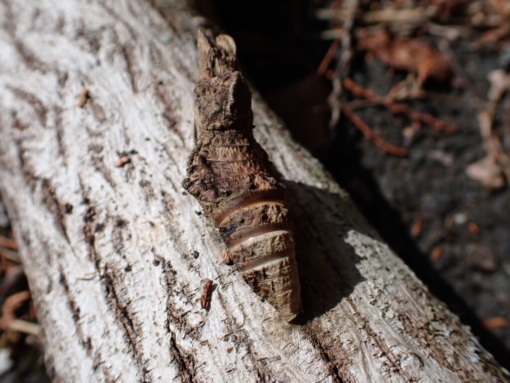切り倒された丸太にくっついていた。無事に羽化できるだろうか。