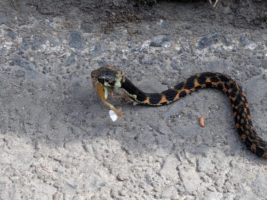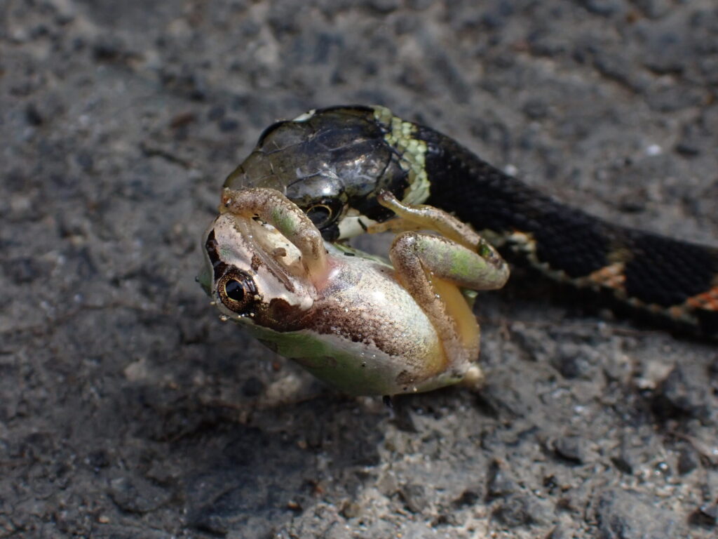 かなり探してようやく食事中のヤマカガシを発見。今年初のヘビとなった。